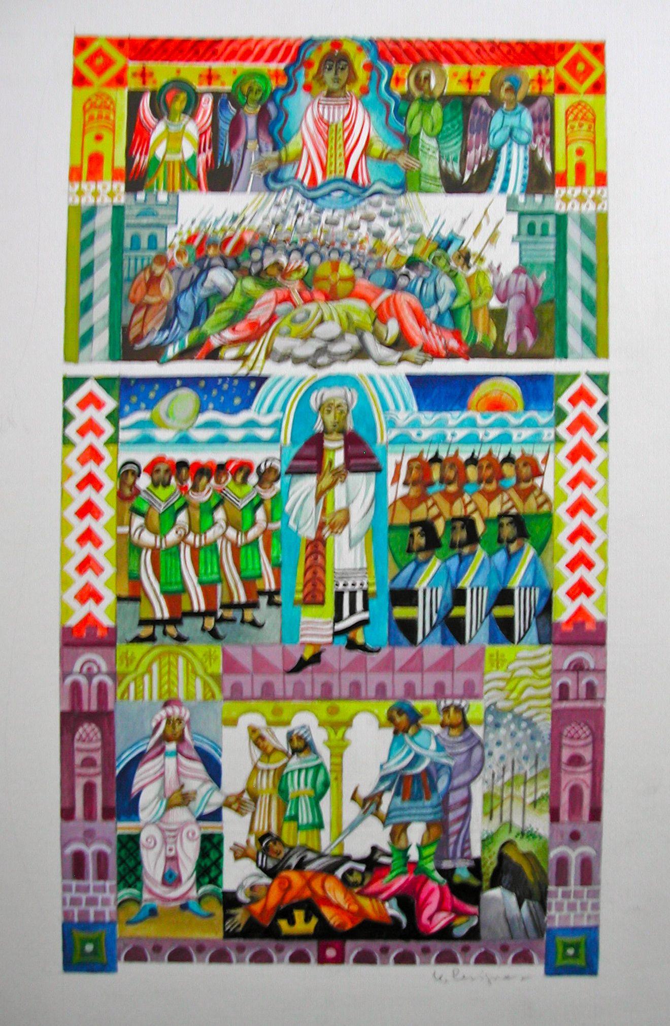 The Bible was during his last years from 1985 as a major topic in which he immersed himself. With more than 100 watercolors and a same amount of sketches we see depicted the history of the Bible figurative in miniature.